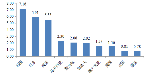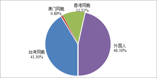 2020年1-12月,厦门接待入境过夜游客89.88万人次,同比下降69.77%。其中,接待台湾同胞37.12万人次,占入境过夜游客总数的41.30%,同比下降64.76%;接待香港同胞10.16万人次,占入境过夜游客总数的11.31%,同比下降67.70%;接待澳门同胞0.80万人次,占入境过夜游客总数的0.89%,同比下降53.72%;接待外国人41.80万人次,占入境过夜游客总数的46.50%,同比下降73.68%。(见图一)